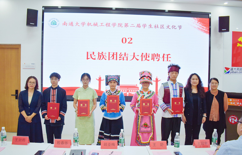活动现场,封琴宣读学院“民族团结大使”聘任名单,王舒、顾亚梅和殷春华共同颁发聘书。王冠宇发布校地联合组建的民族团结实践团队队名——“‘械’手同心,‘桥’见未来”民族团结实践团,陈桥街道党工委委员王澍雨为团队负责人授旗。